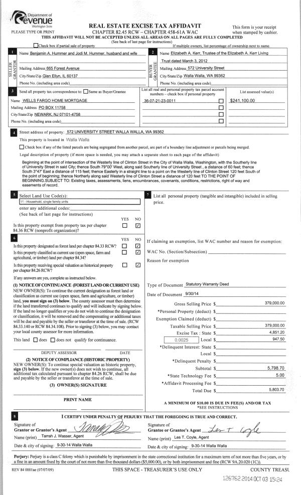 | 1 | 09/30/2014 | SWD | STATUTORY WARRANTY DEED | HUMMER BENJAMIN A & JODI M | ELIZABETH A KERR LIVING TRUST | | | $379,000.00 | 126762 | 2014-07284 |