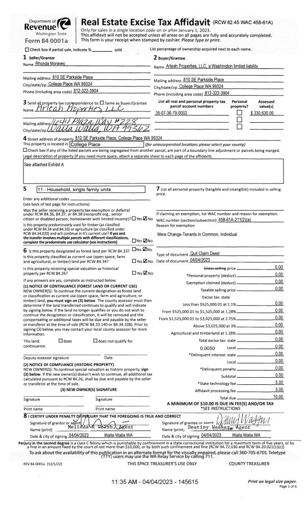 | 2 | 04/04/2023 | QCD | QUIT CLAIM DEED | MORAVEC RHONDA | ARLEAH PROPERTIES LLC | | | | 145615 | 2023-01730 |