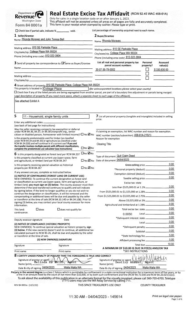 | 3 | 04/04/2023 | QCD | QUIT CLAIM DEED | MORAVEC RHONDA | MORAVEC RHONDA | | | | 145614 | 2023-01729 |