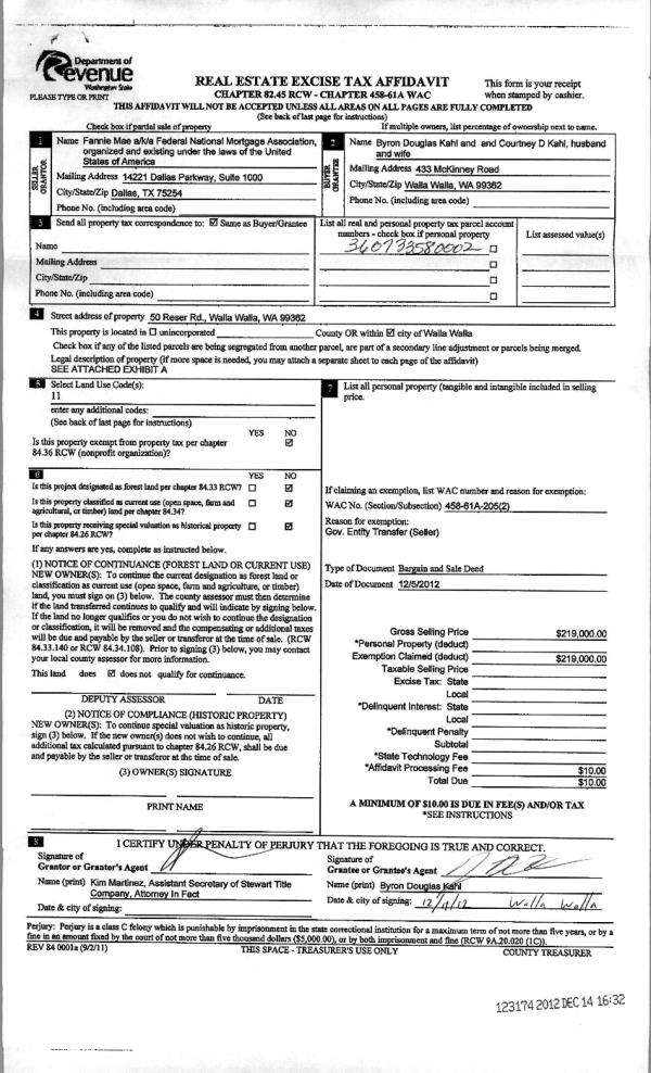 | 2 | 12/14/2012 | WARRANTY D | WARRANTY DEED | FEDERAL NATIONAL MORTGAGE ASSO | KAHL, BYRON DOUGLAS & COURTNEY | | | $219,000.00 | 123174 | 2012-11207 |