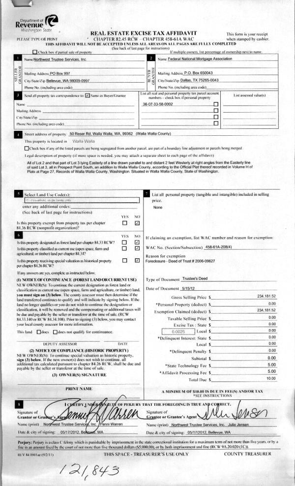| 3 | 05/18/2012 | TRUSTEES D | TRUSTEE'S DEED | NORTHWEST TRUSTEE SERVICES INC | FEDERAL NATIONAL MORTGAGE~ASSO | | | $234,181.00 | 121843 | 2012-04095 |