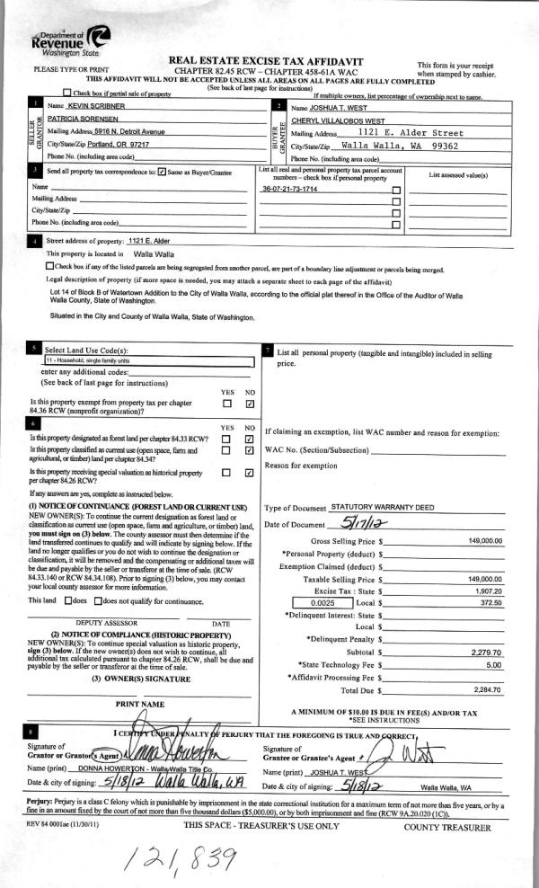 | 3 | 05/18/2012 | WARRANTY D | WARRANTY DEED | SCRIBNER, KEVIN | WEST, JOSHUA T & CHERYL VILLAL | | | $149,000.00 | 121839 | 2012-04086 |