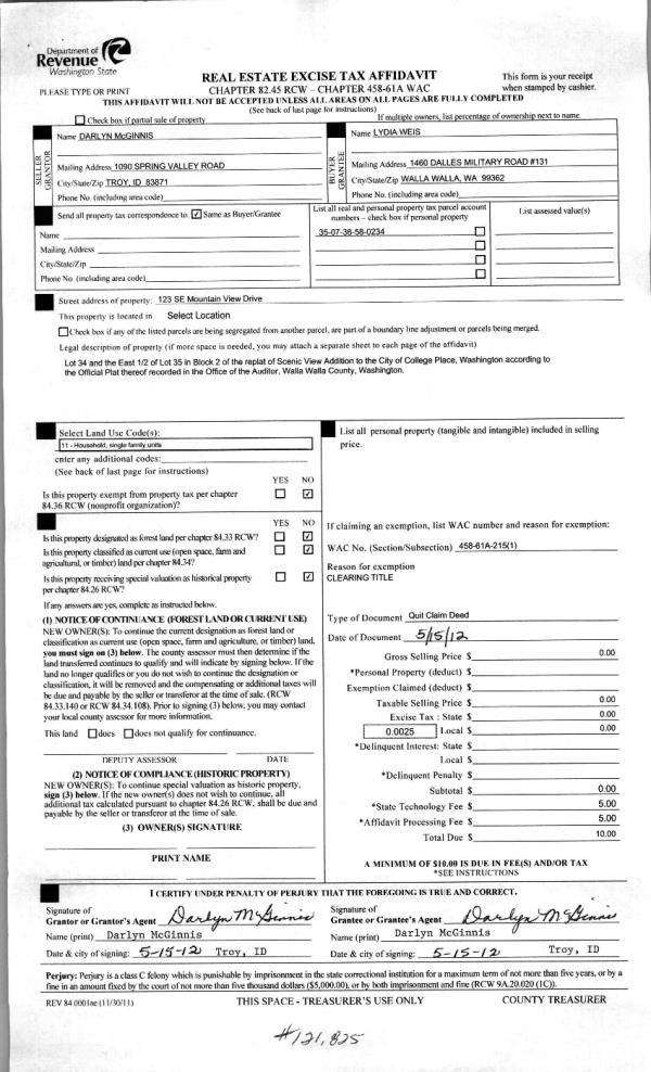 | 4 | 05/16/2012 | QCD | QUIT CLAIM DEED | MC GINNIS, DARLYN | WEIS, LYDIA | | | | 121825 | 2012-03967 |