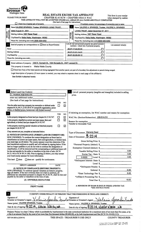 | 2 | 09/12/2014 | WARRANTY D | WARRANTY DEED | SPARKS LIVING TRUST | VALERIE A SPARKES LIVING TRUST | 3-PARCELS | | | 126628 | 2014-06693 |