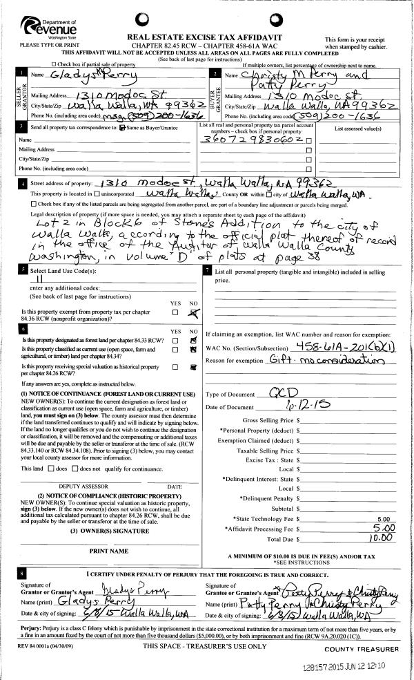 | 4 | 06/08/2015 | QCD | QUIT CLAIM DEED | PERRY GLADYS M ESTATE OF | PERRY CHRISTY M | | | $0.00 | 128157 | 2015-04960 |