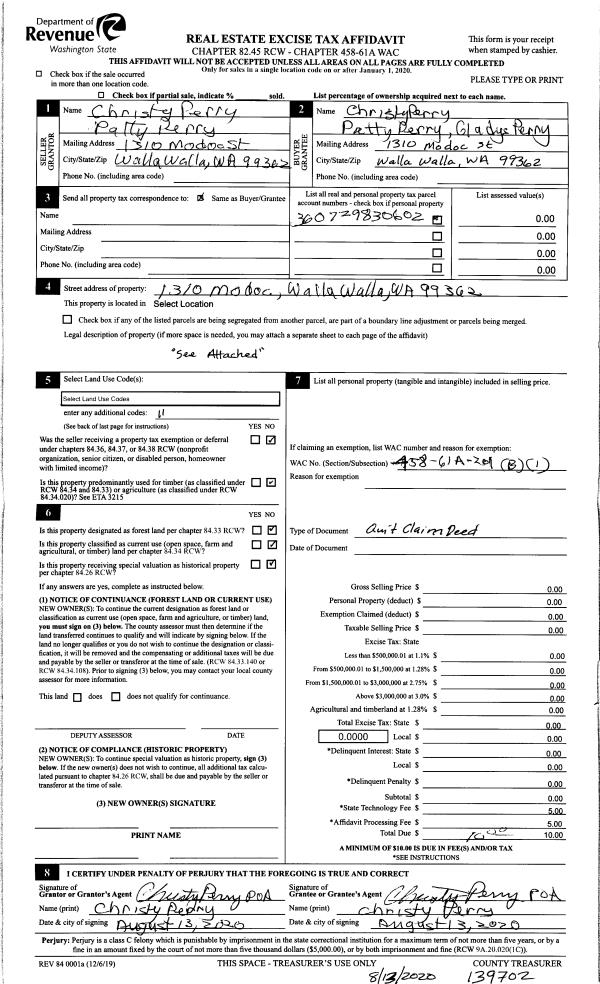 | 3 | 08/13/2020 | QCD | QUIT CLAIM DEED | PERRY CHRISTY M | PERRY GLADYS M ESTATE OF | | | $0.00 | 139702 | 2020-08030 |