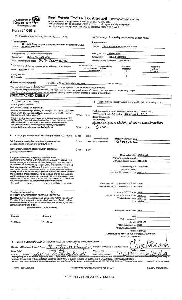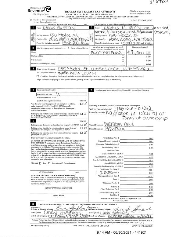 | 2 | 03/26/2021 | WARRANTY D | WARRANTY DEED | PERRY GLADYS M ESTATE OF | PERRY GLADYS M ESTATE OF | | | $0.00 | 141921 | 2021-07956 |