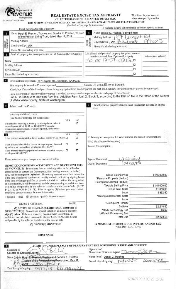| 1 | 12/23/2015 | SWD | STATUTORY WARRANTY DEED | PRESTON LIVING TRUST | HUGHES DANIEL C | | | $145,000.00 | 129407 | 2015-11013 |