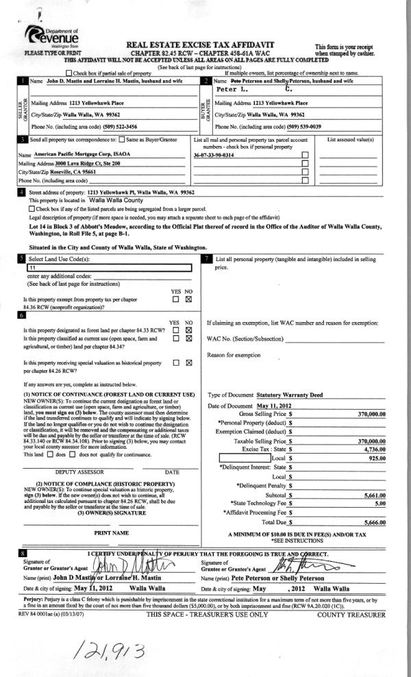 | 3 | 06/01/2012 | WARRANTY D | WARRANTY DEED | MASTIN, JOHN D & LORRAINE H | PETERSON, PETER L & SHELLY C | | | $370,000.00 | 121913 | 2012-04545 |