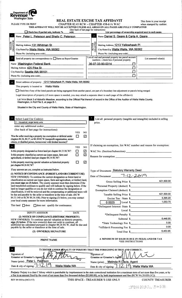 | 2 | 07/15/2019 | SWD | STATUTORY WARRANTY DEED | PETERSON PETER L & SHELLY C | GEARE DANIEL S & CARLA A | | | $421,500.00 | 137288 | 2019-05132 |