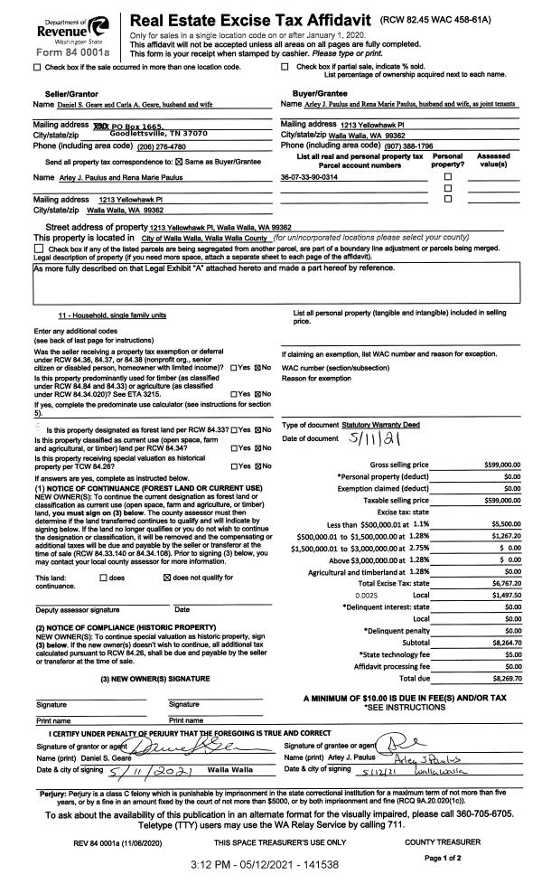 | 1 | 05/12/2021 | SWD | STATUTORY WARRANTY DEED | GEARE DANIEL S & CARLA A | PAULUS ARLEY J & RENA MARIE | | | $599,000.00 | 141538 | 2021-05738 |