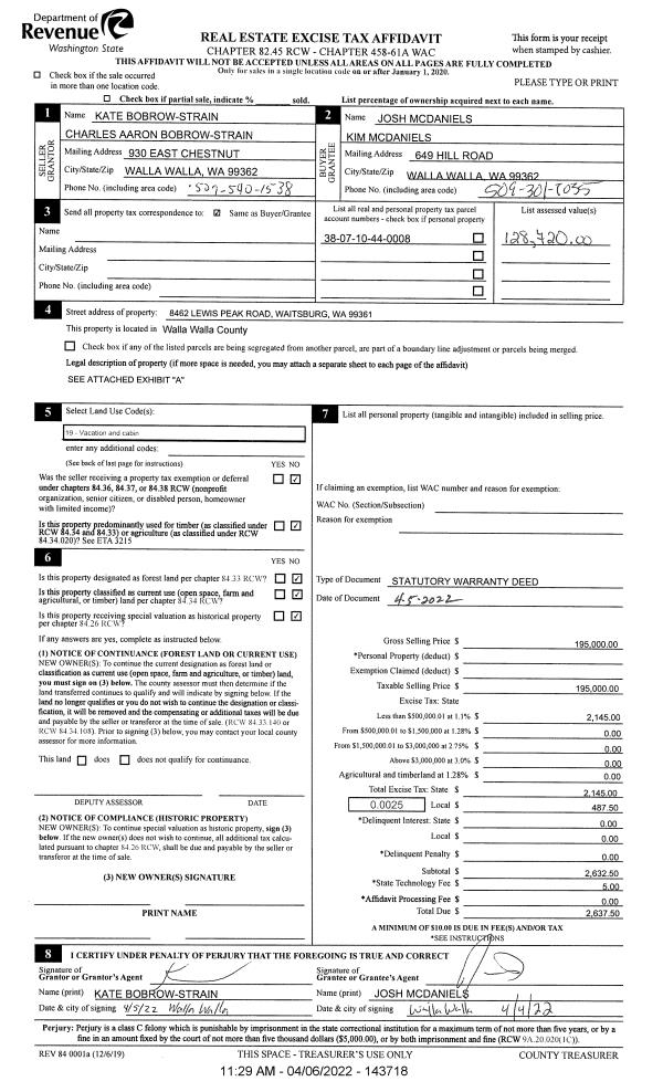 | 1 | 04/06/2022 | SWD | STATUTORY WARRANTY DEED | BOBROW-STRAIN CHARLES AARON & KATE | MCDANIELS JOSH & KIM | | | $195,000.00 | 143718 | 2022-02860 |