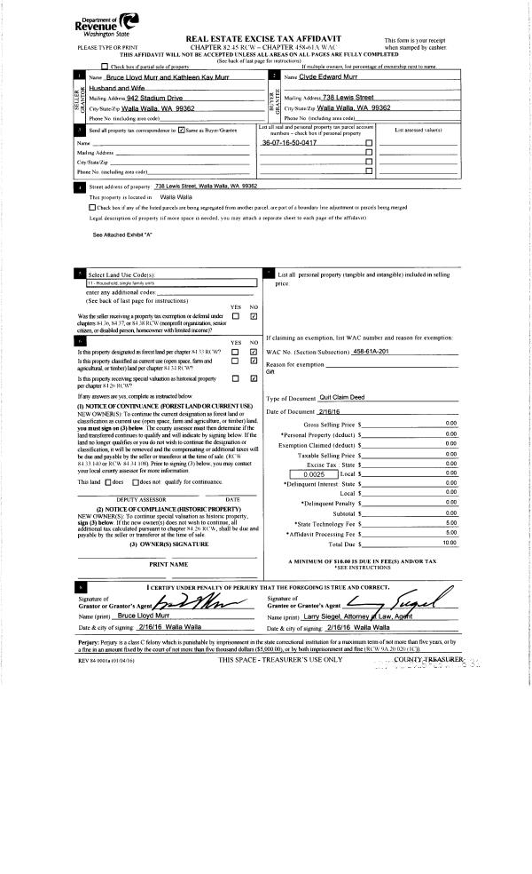 | 1 | 02/16/2016 | QCD | QUIT CLAIM DEED | MURR BRUCE L | MURR CLYDE EDWARD | | | $0.00 | 129701 | 2016-01201 |