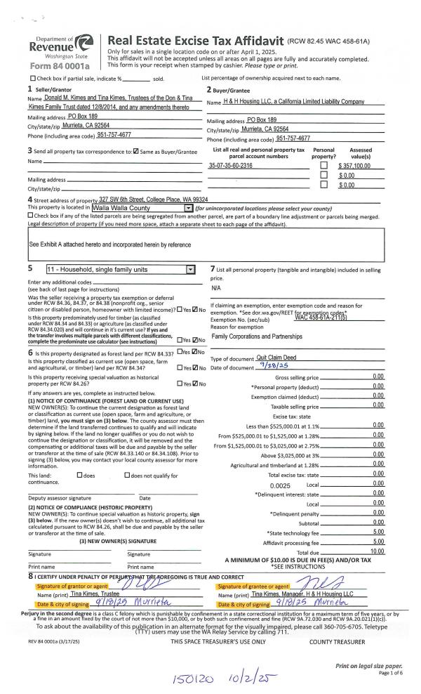 | 1 | 10/02/2025 | QCD | QUIT CLAIM DEED | KIMES DON & TINA FAMILY TRUST | H & H HOUSING LLC | | | | 150120 | 2025-06043 |