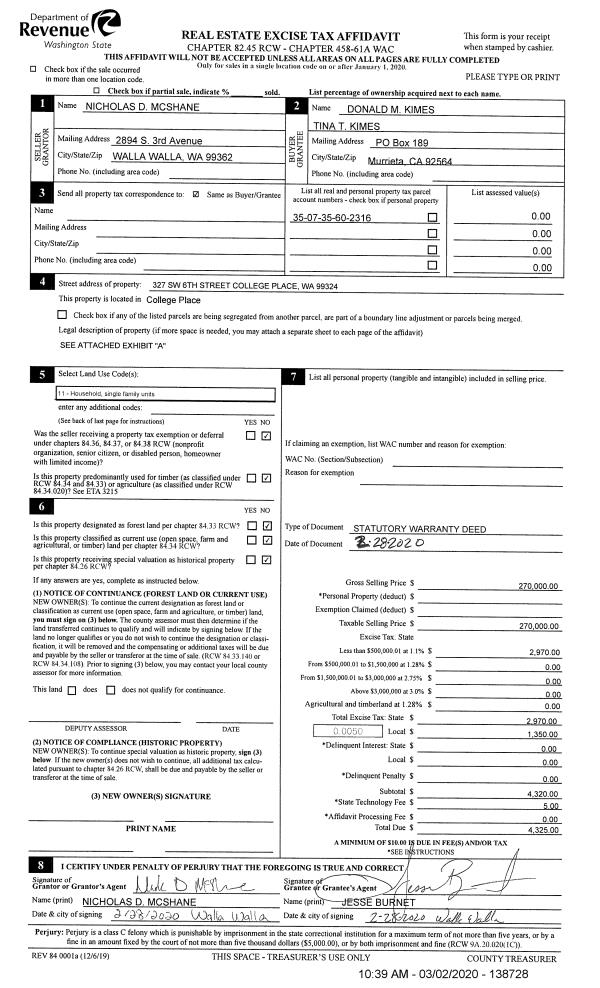 | 3 | 03/02/2020 | SWD | STATUTORY WARRANTY DEED | MC SHANE NICHOLAS D | KIMES DONALD M & TINA T | | | $270,000.00 | 138728 | 2020-01942 |