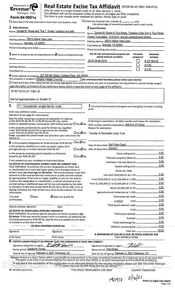 | 2 | 02/03/2021 | QCD | QUIT CLAIM DEED | KIMES DONALD M & TINA T | KIMES DON & TINA FAMILY TRUST | | | $0.00 | 140917 | 2021-01840 |