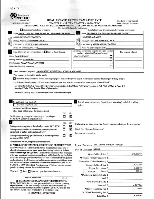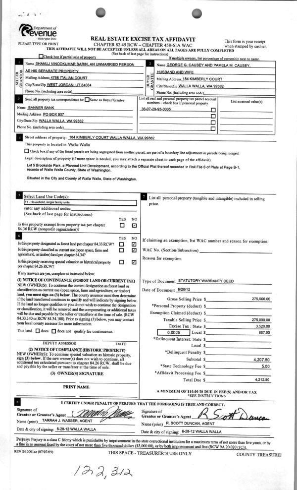 | 4 | 07/06/2012 | WARRANTY D | WARRANTY DEED | SARIN, SHANUJ VINODKUMAR | CAUSEY, GEORGE G & PAMELA M | | | $275,000.00 | 122312 | 2012-05709 |