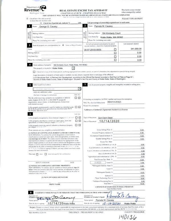 | 1 | 10/16/2020 | QCD | QUIT CLAIM DEED | CAUSEY GEORGE G & PAMELA M | CAUSEY PAMELA M | | | | 140136 | 2020-10781 |
