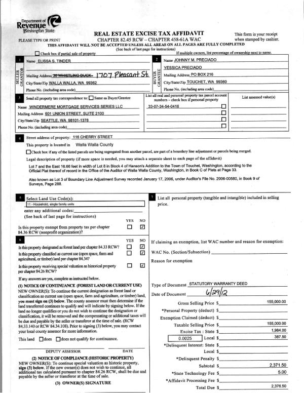 | 1 | 07/06/2012 | WARRANTY D | WARRANTY DEED | TINDER, ELISSA S | PRECIADO, JOHNNY M & YESSICA | | | $155,000.00 | 122308 | 2012-05701 |
