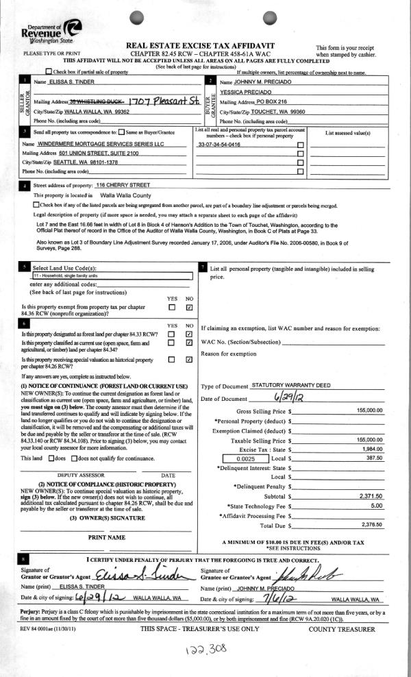 | 1 | 07/06/2012 | WARRANTY D | WARRANTY DEED | TINDER, ELISSA S | PRECIADO, JOHNNY M & YESSICA | | | $155,000.00 | 122308 | 2012-05701 |