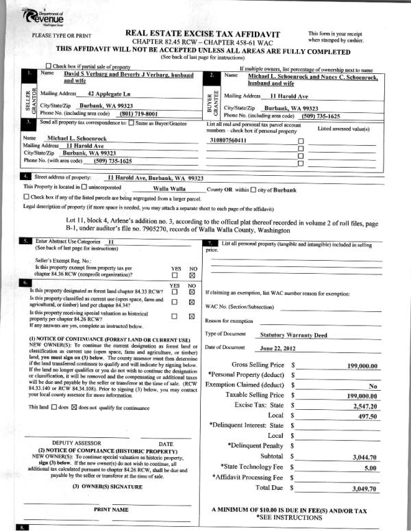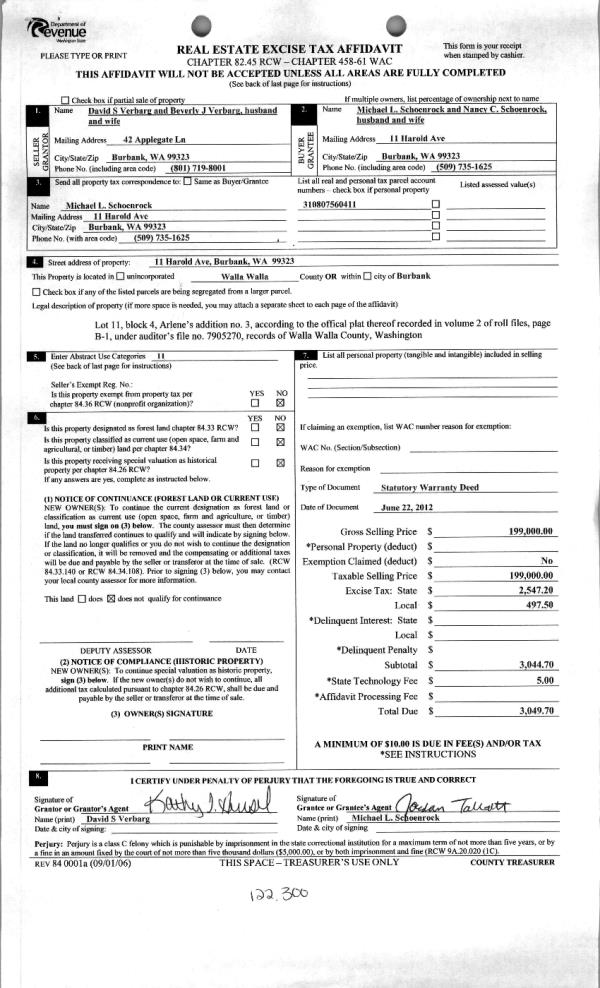 | 3 | 07/03/2012 | WARRANTY D | WARRANTY DEED | VERBARG, DAVID S & BEVERLY J | SCHOENROCK, MICHAEL L & NANCY | | | $199,000.00 | 122300 | 2012-05627 |