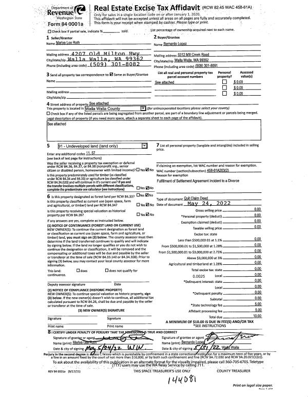 | 1 | 06/03/2022 | QCD | QUIT CLAIM DEED | LOPEZ BERNARDO | LOPEZ BERNARDO | | 5-PARCELS | $0.00 | 144081 | 2022-04758 |