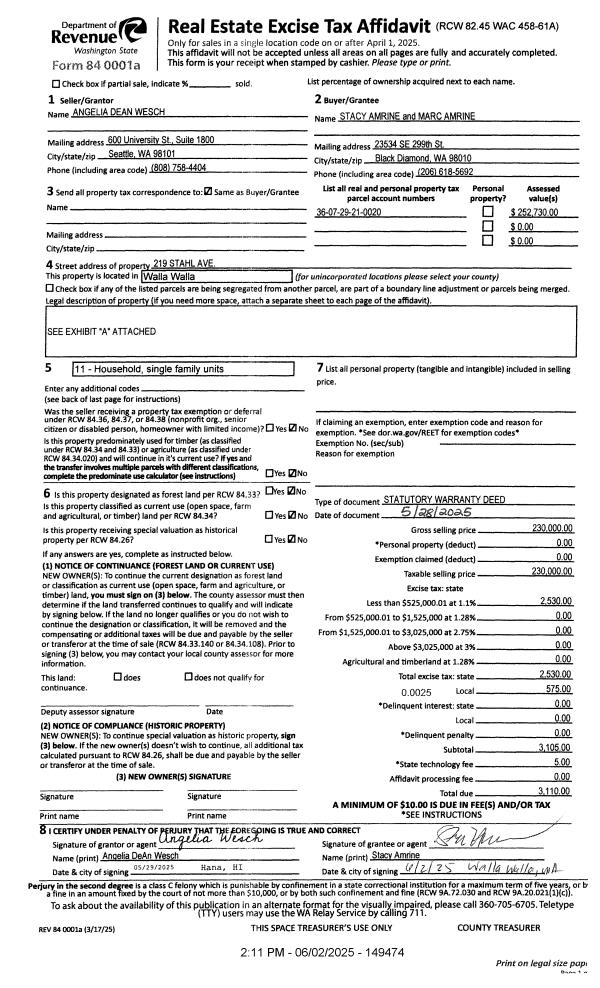 | 1 | 06/02/2025 | SWD | STATUTORY WARRANTY DEED | WESCH ANGELIA DEAN | AMRINE STACY & MARC | | | $230,000.00 | 149474 | 2025-03087 |
