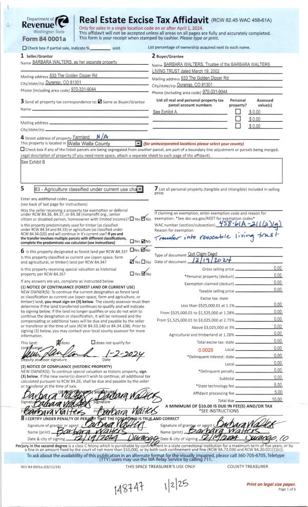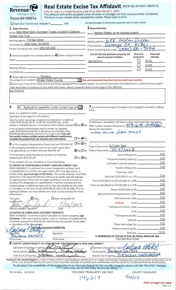 | 2 | 07/26/2023 | QCD | QUIT CLAIM DEED | WALTERS BARBARA | WALTERS BARBARA | 6-PARCELS | | $0.00 | 146217 | 2023-04242 |