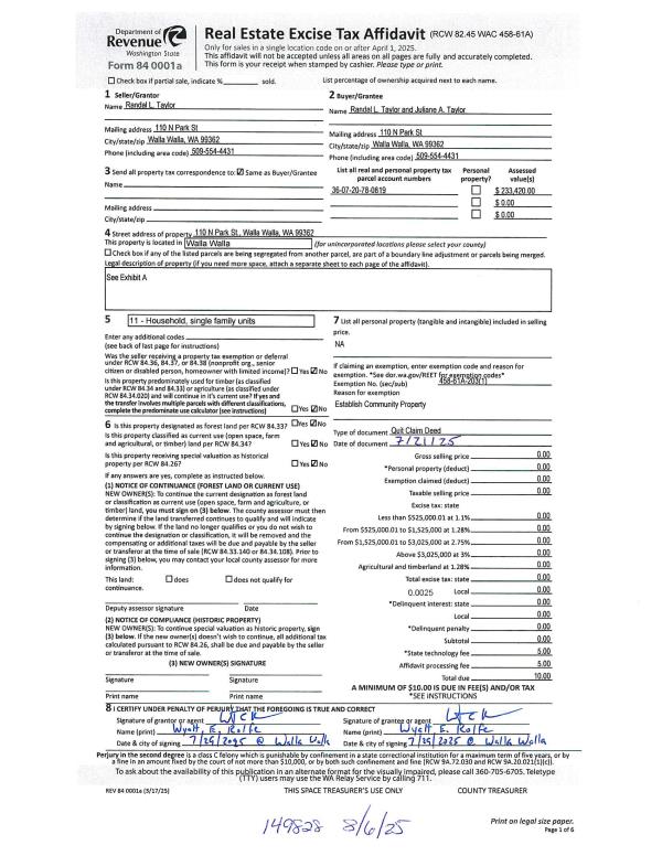 | 1 | 08/06/2025 | QCD | QUIT CLAIM DEED | TAYLOR RANDAL L | TAYLOR RANDAL L & JULIANE A | | | | 149828 | 2025-04645 |