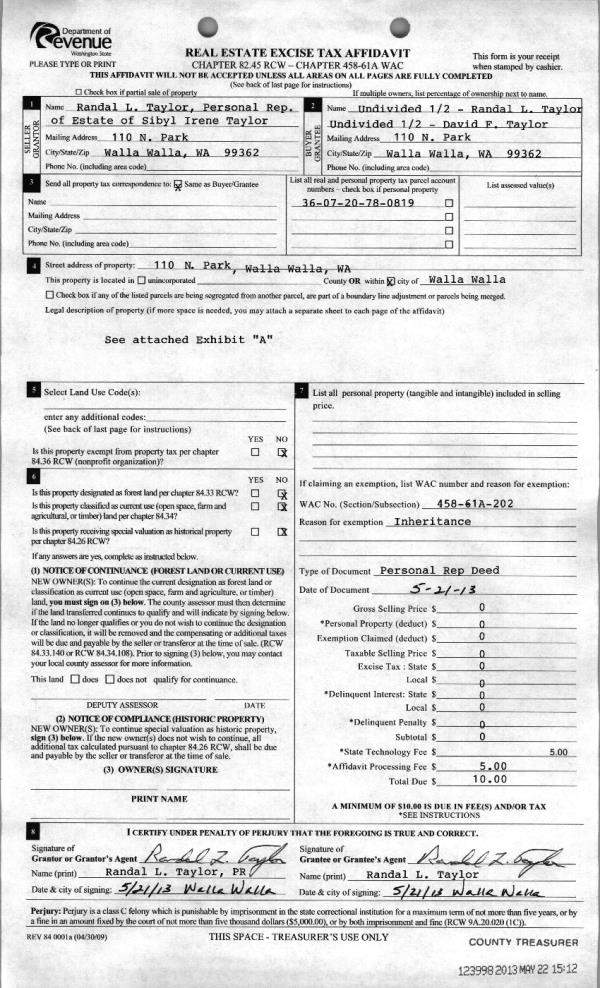 | 3 | 05/22/2013 | WARRANTY D | WARRANTY DEED | TAYLOR, SIBYL IRENE ESTATE OF | TAYLOR, RANDAL L | | | $0.00 | 123998 | 2013-05137 |
