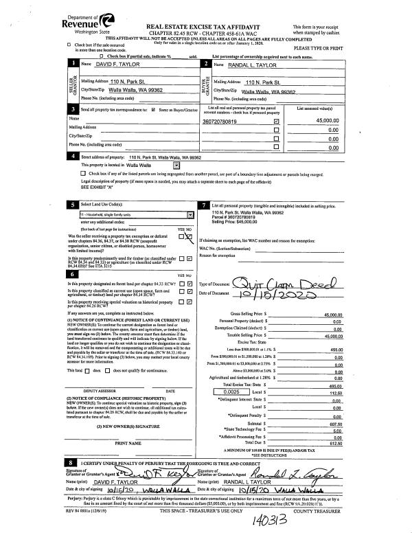 | 2 | 11/10/2020 | QCD | QUIT CLAIM DEED | TAYLOR DAVID F | TAYLOR RANDAL L | | | $45,000.00 | 140313 | 2020-11873 |