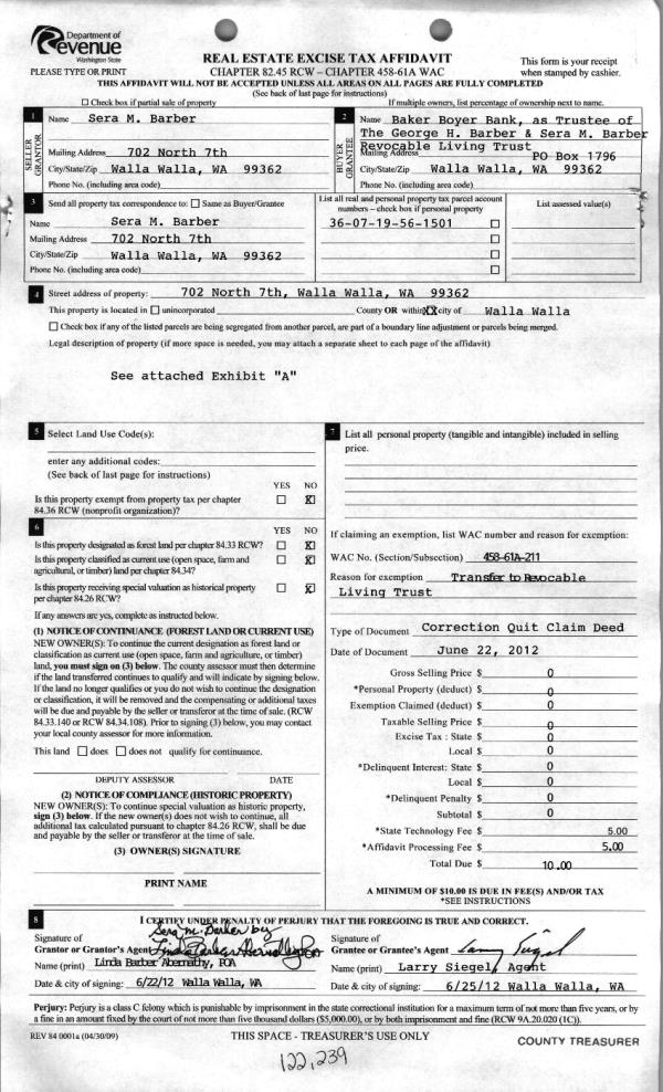 | 3 | 06/25/2012 | QCD | QUIT CLAIM DEED | BARBER, SERA M (AS TRUSTEE) | BARBER, GEORGE H & SERA M | | | $0.00 | 122239 | 2012-05327 |