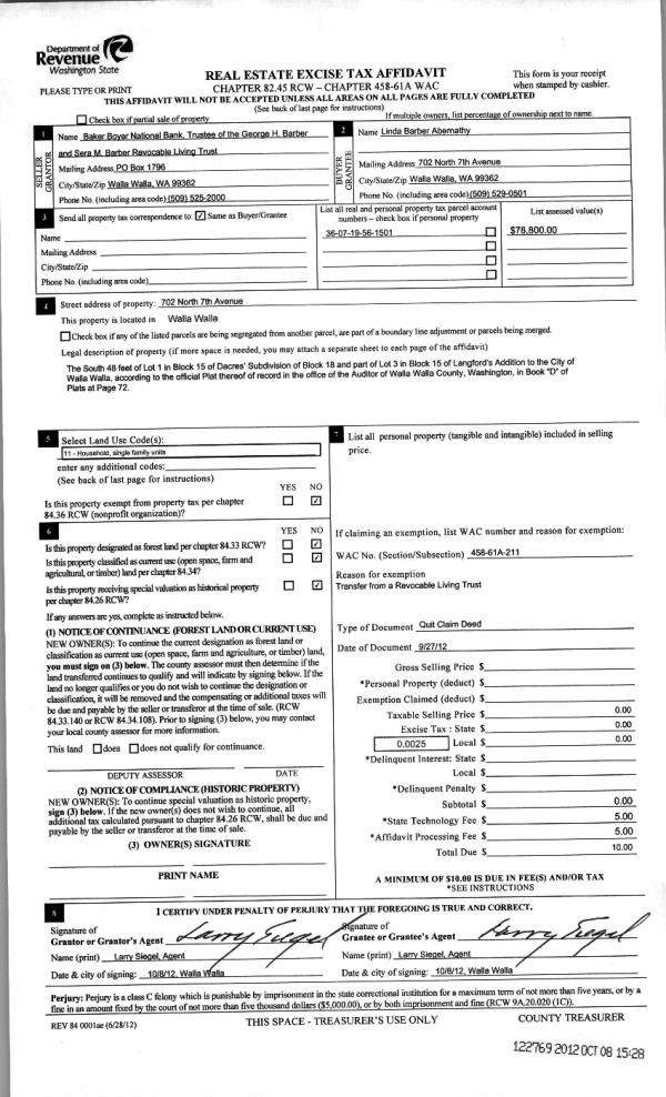 | 2 | 10/08/2012 | QCD | QUIT CLAIM DEED | BARBER, GEORGE H & SERA M | BARBER, SERA M LIFE EST | | | $0.00 | 122769 | 2012-08860 |