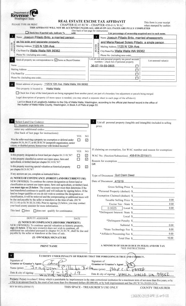 | 1 | 04/15/2019 | QCD | QUIT CLAIM DEED | BRITO JOAQUIN PILLADO | BRITO JOAQUIN PILLADO | | | $0.00 | 136690 | 2019-02390 |