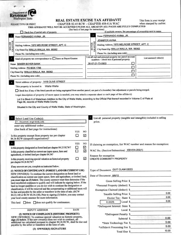 | 2 | 08/06/2012 | QCD | QUIT CLAIM DEED | AVINA, FERNANDO JR | AVINA, FERNANDO JR & JENNIFER | | | $0.00 | 122458 | 2012-06720 |