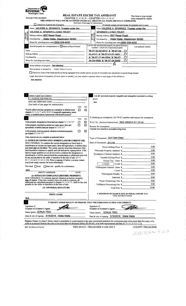 | 3 | 05/16/2016 | QCD | QUIT CLAIM DEED | VALERIE A SPARKES LIVING TRUST | SPARKES LIVING TRUST | | | $0.00 | 130220 | 2016-03659 |
