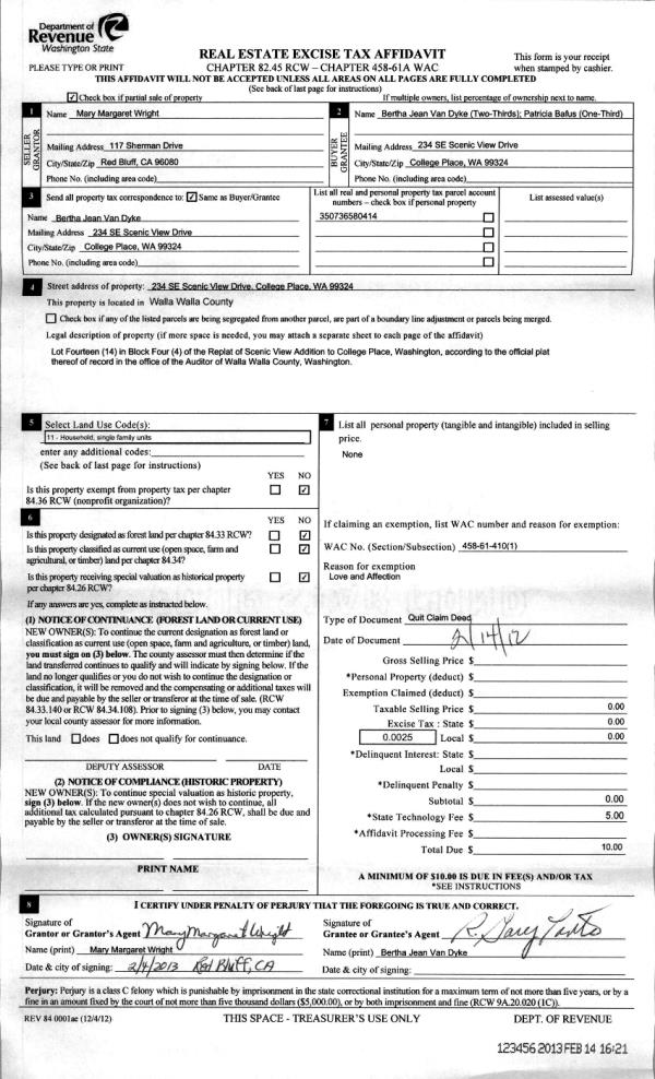 | 3 | 02/14/2013 | QCD | QUIT CLAIM DEED | WRIGHT, MARY MARGARET | VAN DYKE, BERTHA JEAN | | | $0.00 | 123456 | 2013-01324 |
