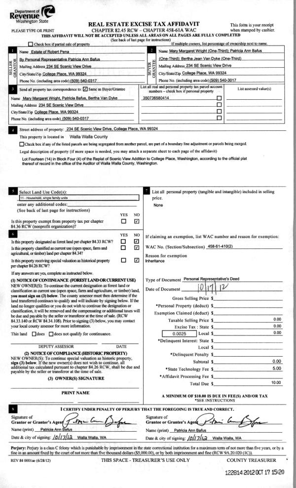 | 5 | 09/17/2012 | WARRANTY D | WARRANTY DEED | PENA, ROBERT ESTATE OF | BAFUS, PATRICIA ANN | | | $0.00 | 0 | CC #12-4-00067-9 |