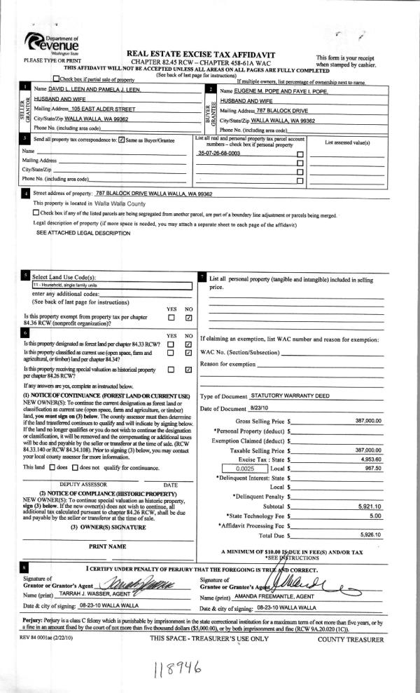 | 4 | 08/31/2010 | WARRANTY D | WARRANTY DEED | LEEN, DAVID L & PAMELA J | POPE, EUGENE M & FAYE I | | | $387,000.00 | 118946 | 2010-06754 |