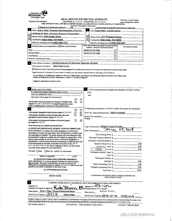 | 3 | 01/28/2019 | LOPA | LACK OF PROBATE AFFIDAVIT | KLEIN DUANE ESTATE | KLEIN SHIRLEY | | | $0.00 | 136310 | 2019-00578 |