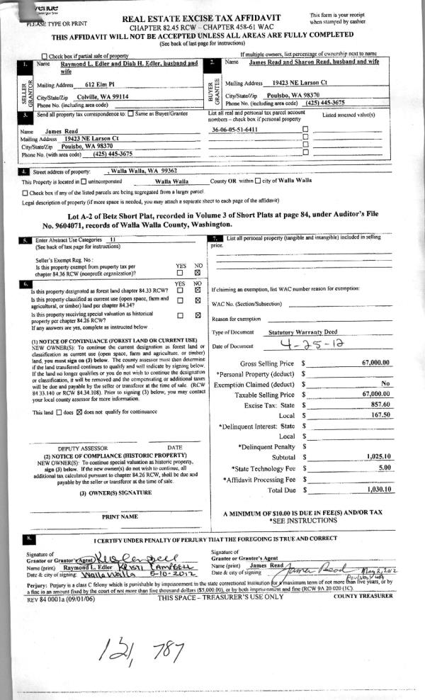 | 2 | 05/10/2012 | WARRANTY D | WARRANTY DEED | EDLER, RAYMOND L & DIAH H | READ, JAMES & SHARON | | | $67,000.00 | 121787 | 2012-03806 |