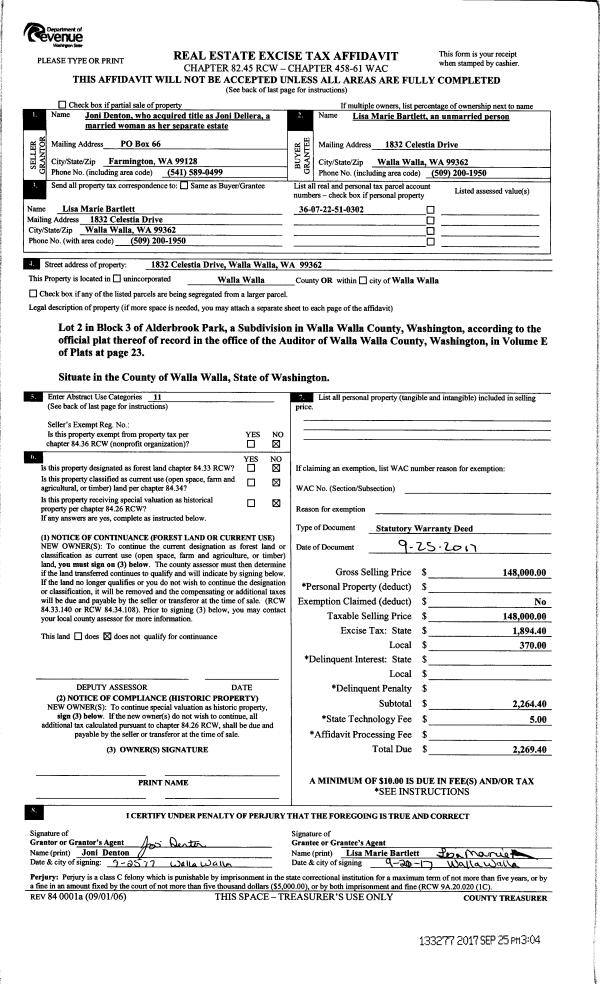 | 2 | 09/25/2017 | SWD | STATUTORY WARRANTY DEED | DELLERA JONI | BARTLETT LISA MARIE | | | $148,000.00 | 133277 | 2017-07575 |