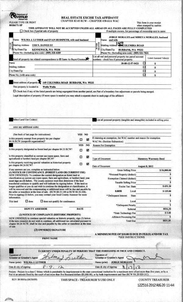 | 3 | 08/20/2012 | WARRANTY D | WARRANTY DEED | LUTHER, WILMA J | MORALES, JORGE & MIREYA | | | $54,000.00 | 122516 | 2012-07146 |