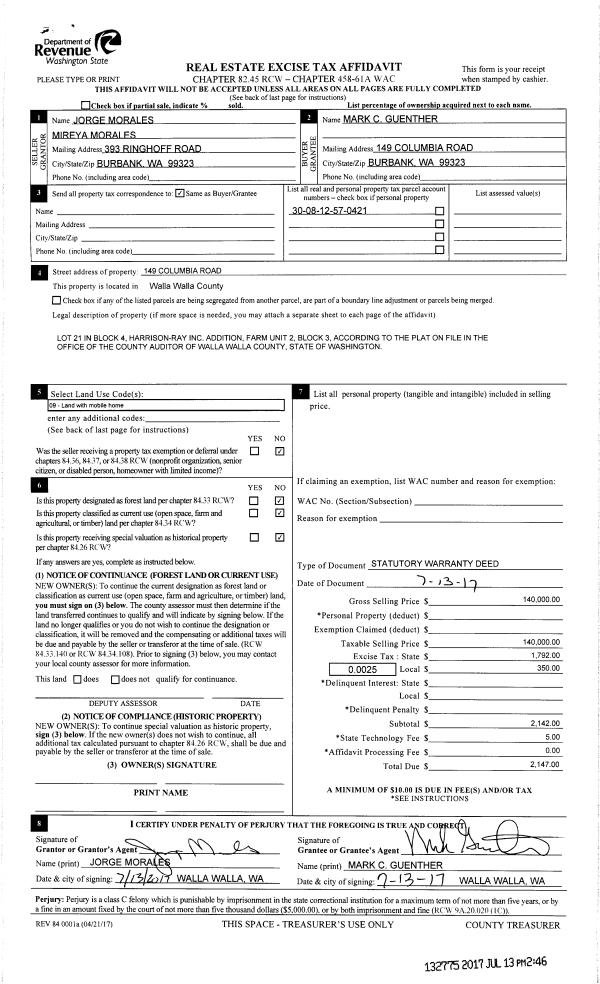 | 2 | 07/13/2017 | SWD | STATUTORY WARRANTY DEED | MORALES JORGE & MIREYA | GUENTHER MARK C | | | $140,000.00 | 132775 | 2017-05369 |