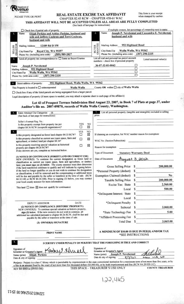| 4 | 08/08/2012 | WARRANTY D | WARRANTY DEED | PERKINS, ELIJAH & ASHLEY | NEVSHEMAL, JOSEPH P & CASSANDR | | | $200,000.00 | 122465 | 2012-06793 |