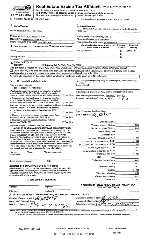| 1 | 08/13/2025 | QCD | QUIT CLAIM DEED | BATES SHEENA LEA | BATES SHEENA LEA & RAYMOND EARL PURSLEY III | | | | 149858 | 2025-04798 |