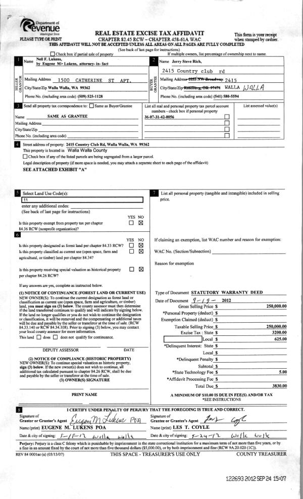 | 4 | 09/24/2012 | WARRANTY D | WARRANTY DEED | LUKENS, NELL F | RICH, JERRY STEVE | | | $250,000.00 | 122693 | 2012-08352 |