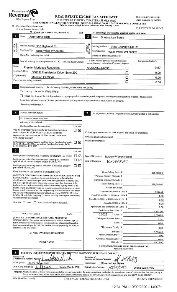 | 3 | 10/09/2020 | SWD | STATUTORY WARRANTY DEED | RICH JERRY STEVE | BATES SHEENA LEA | | | $420,000.00 | 140071 | 2020-10448 |