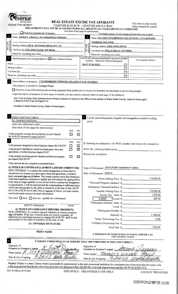 | 5 | 09/25/2012 | WARRANTY D | WARRANTY DEED | ARNOLD, DORIS E | STALBERGER, MITCHELL & COLLEEN | | | $115,000.00 | 122699 | 2012-08367 |