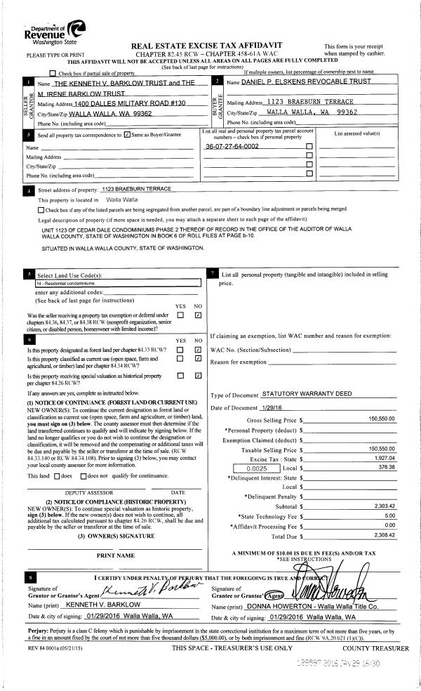 | 3 | 01/29/2016 | SWD | STATUTORY WARRANTY DEED | KENNETH V BARKLOW TRUST & M IRENE BARKLOW TRUST | THE DANIEL P ELSKENS REVOCABLE TRUST | | | $150,550.00 | 129597 | 2016-00708 |